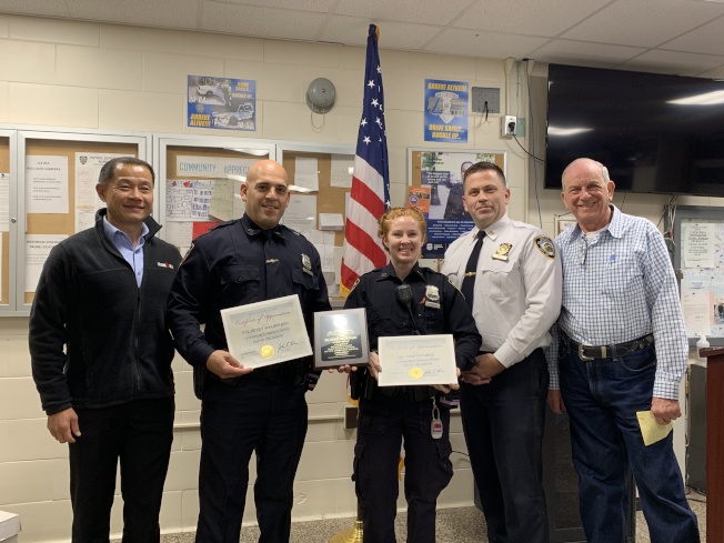 劉醇逸(左一)及霍爾(右二)向警員Henry Maldonado(左二)及警員Kristin Kirby(右三)頒發本月最佳警員獎,右一是分局警民會主席Jack Fried。(本報記者/攝影)