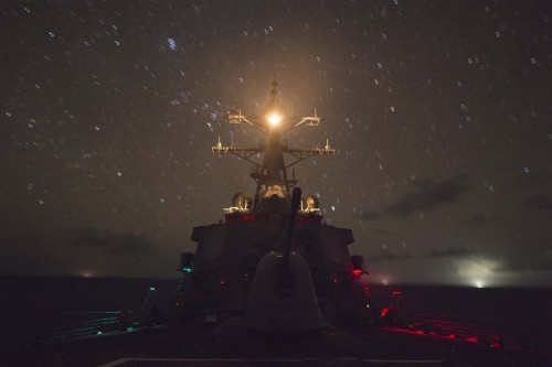 图为11月11日夜间美军导弹驱逐舰“菲茨杰拉德号”(DDG62)在南海航行画面。