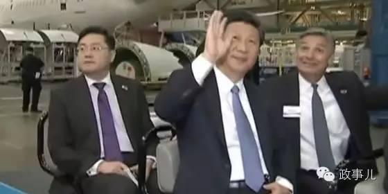与上述“主席警卫”出现在波音公司厂房里的电瓶车上一样,习近平身后的第三排坐着的就是秦刚。画面显示,秦刚坐在习主席后面,手拿一个红色的笔记本状东西。而在这之前,习近平抵达波音公司时,秦刚站在最前面为习近平介绍波音公司高层。