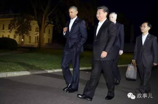 9月24日,习近平与美国奥巴马从白宫西翼步行前往街对面的布莱尔宾馆,出席奥巴马举行的私人晚宴。在步行途中,除了习近平与奥巴马,另外只有孙宁和另外一位美方翻译紧随其后,而同样的场景也曾出现在2014年11月11日,习近平与奥巴马在中南海的“瀛台夜话”中。