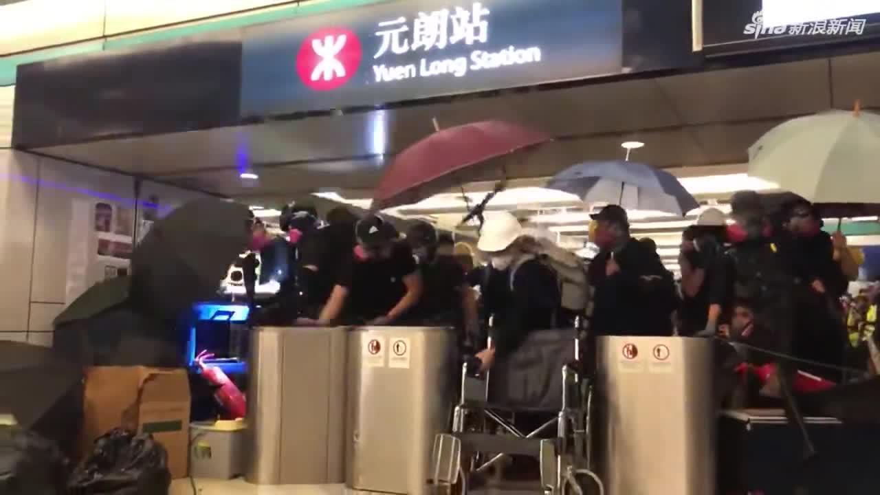 有激进示威分子用侮辱性的语言挑衅警察,并用镭射笔照射。更有暴徒设置路障,扰乱周边交通,并向路面扔下液体、雨伞、铁架等物体,元朗站的出入闸机、灭火器、垃圾桶、消防水管等公共设施被严重破坏,现场一片狼藉。