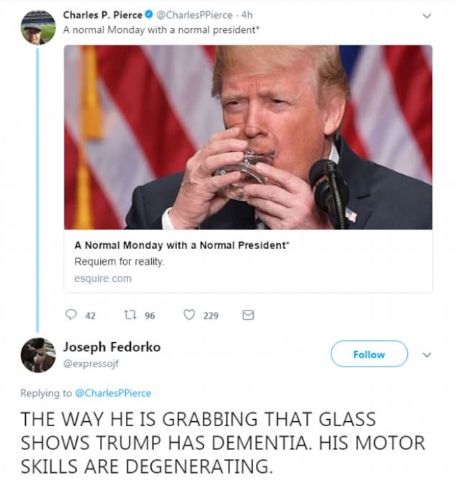 川普像幼童雙手捧杯喝水 腦科專家:早期失智