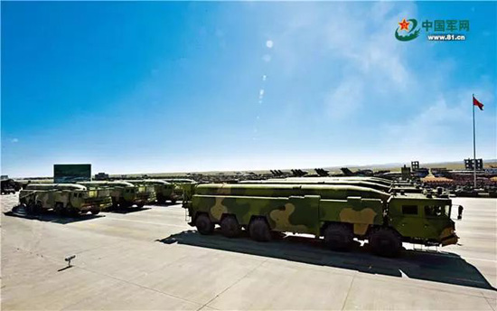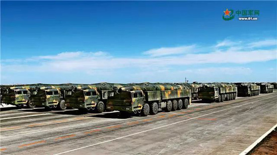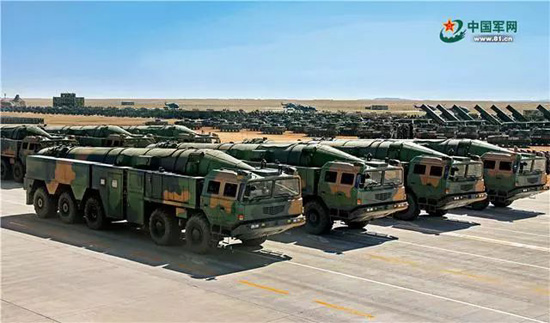 核常兼备导弹方队受阅的东风-26导弹,能够跨区域无依托机动发射,可实施快速核反击和常规中远程精确打击。王卫东 摄