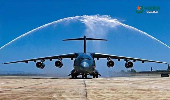 2016年7月6日上午,首架装备中国空军的运-20飞机滑过“水门”,正式列装。金戈铁马唱大风,科技兴军给我军武器装备建设带来的新气象。刘畅 摄