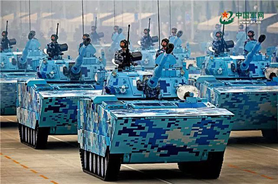 2015年“9.3”阅兵场上16辆05A式两栖突击车,在两辆引导车的引导下,以严整的队形、磅礴的气势通过天安门广场。05A式两栖突击车是我国自行研制的新型海陆两栖突击装备。优越的陆海机动性能、强大的火力配系、较强的综合防护能力、较高的信息化水平,使其足以与世界最先进的两栖装甲战车媲美。