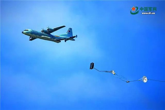 我军运-9战机在“航空飞镖”靶场开放日进行重装空投。杨盼 摄