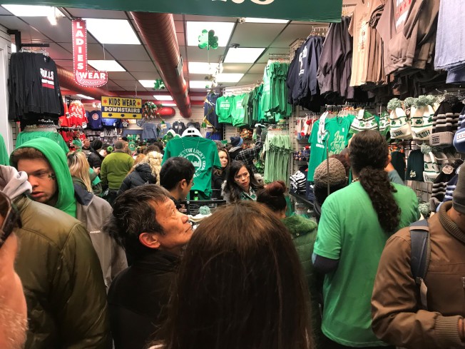販售各種綠色衣物、飾品的商店,17日擠滿消費人潮。(特派員黃惠玲/攝影)