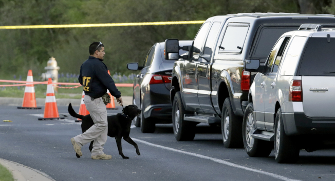 聯邦調查局探員帶著警犬在現場調查。(路透)