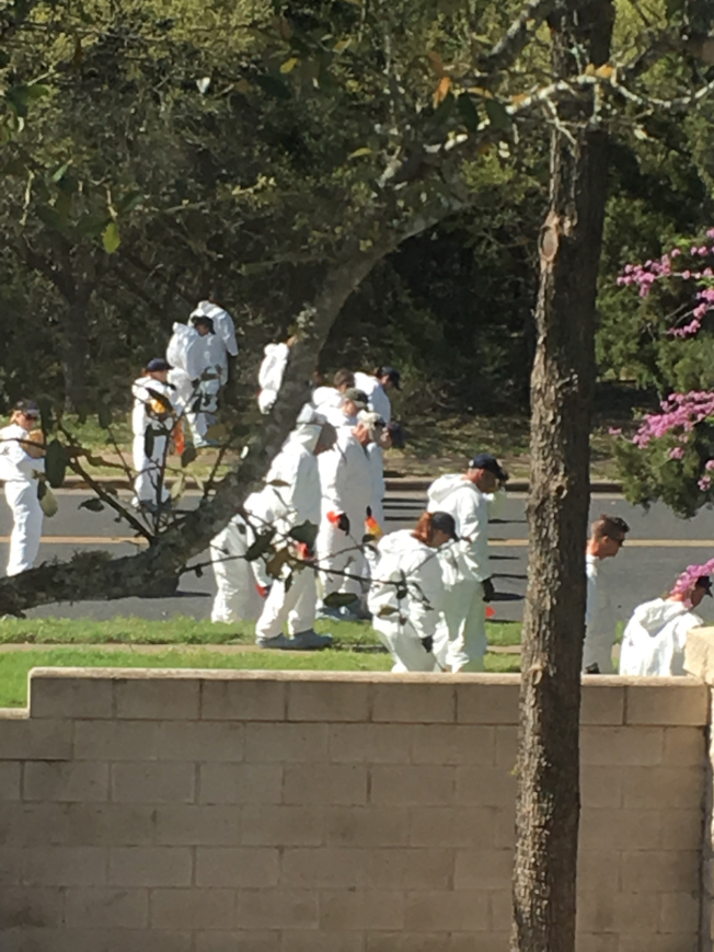 德州州警會同聯邦鑑識人員19日在爆炸現場排查,要找出蛛絲馬跡。 (美聯社)