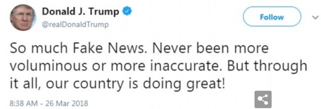 川普總統26日再發推文批評假新聞,但對丹尼爾斯的指控卻始終未置一辭。(取自推特)
