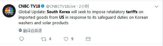美国CNBC报道称,韩国的报复性征税计划是作为“对韩国洗衣机及太阳能产品”的保护责任的回应。