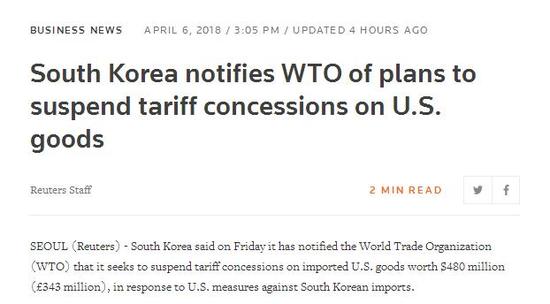 [环球网报道 记者 朱梦颖]中美贸易战燃起烽火几天之后,韩国也吹响了反击美国的号角。据英国路透社6日消息,韩国当日表示,已通知世界贸易组织(WTO),韩国寻求暂停对价值4.8亿美元的美国进口商品所实施的关税减让,作为美国对韩进口产品征收关税的回应。韩方同时也表示,拟对美国商品征收报复性关税。