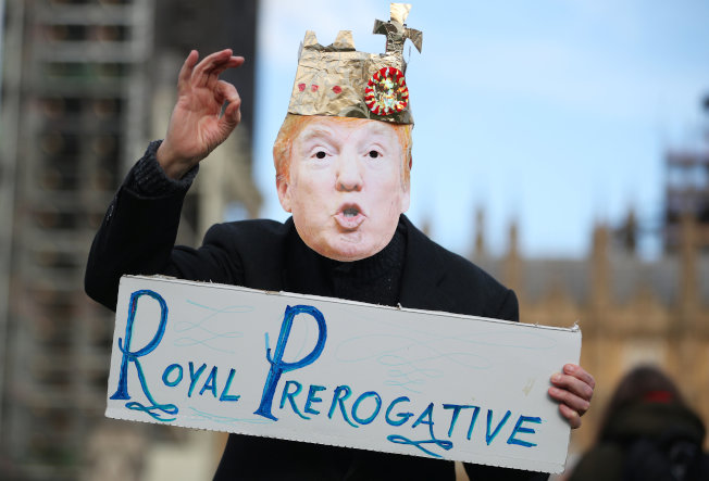 英國倫敦16日有反川普攻擊敘利亞的抗議活動。(歐新社)