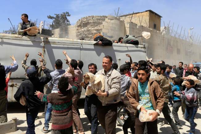 敘利亞政府軍已攻占東古塔鎮,趕走反抗軍。圖為政府工作人員16日在當地發送麵包。(Getty Images)