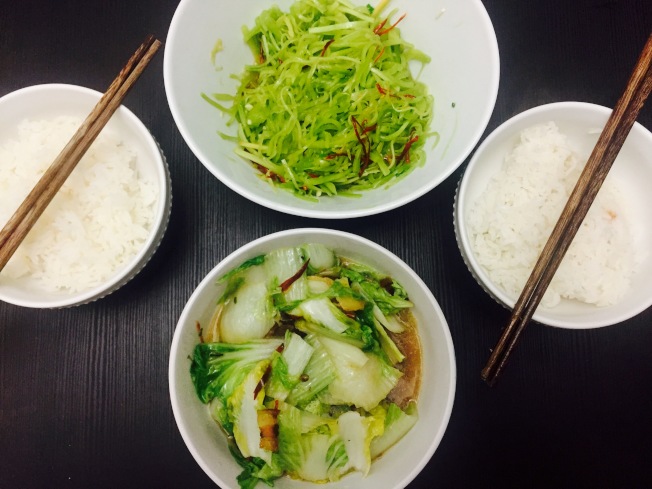 胡Renee自製涼拌萵苣、熗炒白菜。(記者董宇/攝影)