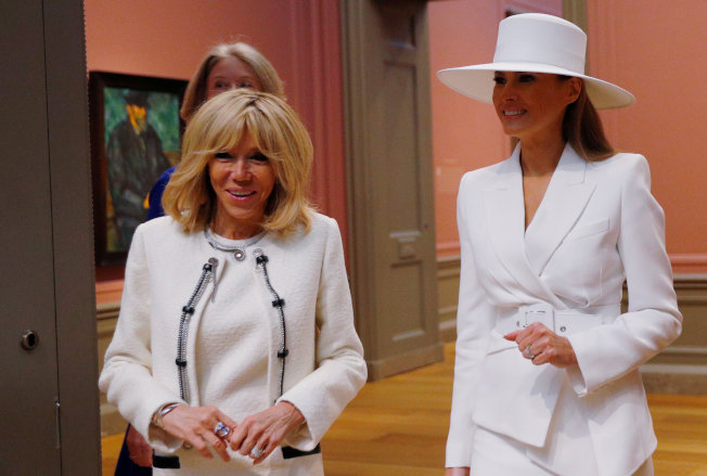 美法兩國第一夫人梅蘭妮亞•川普(右)、碧姬•馬克宏(左)日前同至華府國家藝術館參觀展覽。(路透)