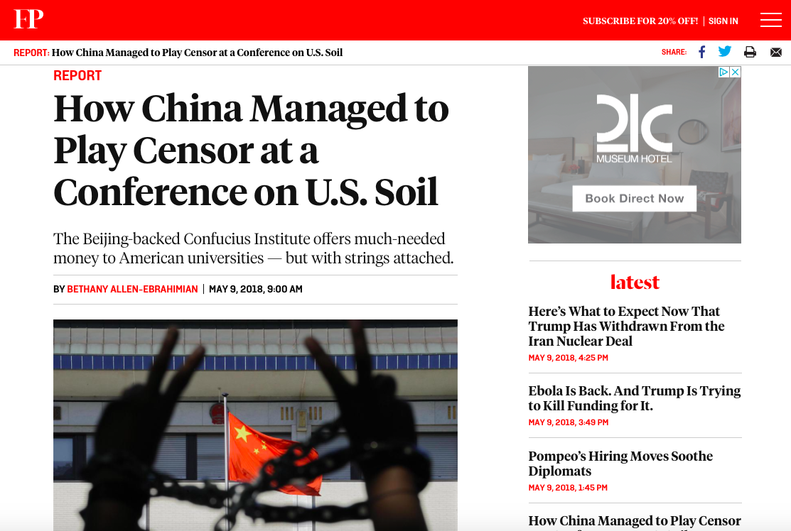 作者艾伯拉希米恩(Bethany Allen-Ebrahimian)撰寫文章,關於中國如何審查在美舉辦的會議;文章寫道,她受邀至薩凡納州立大學新聞與大眾傳播學系發表主題演講並獲頒獎項,在介紹其背景時,她將曾經採訪台灣列為其中一項經歷,但在這次活動的書面資料中,提及台灣部分被刪除。