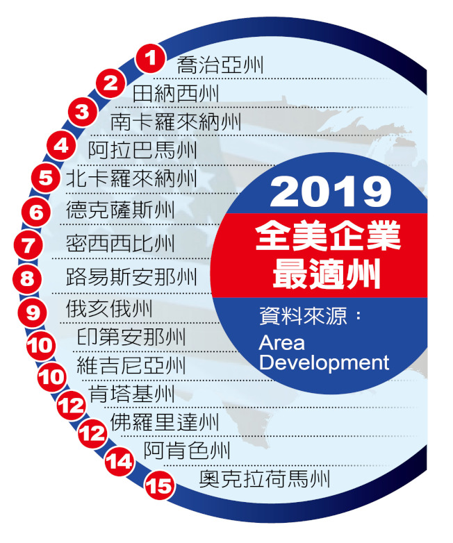 Area Development發行人及主席席亞(Dennis J. Shea)表示,第10屆的最適企業經營州排名是依據該刊物編輯投票的最佳企業設址地、供應鏈、第三方物流、房地產,以及調查該公司資料庫中的企業管理顧問而來。「這些參與投票的企管顧問均是目前仍經手企業選址計畫、數十億元的資本額、面積超過百萬頃的選址地,更在50州創造數以千計工作機會。」